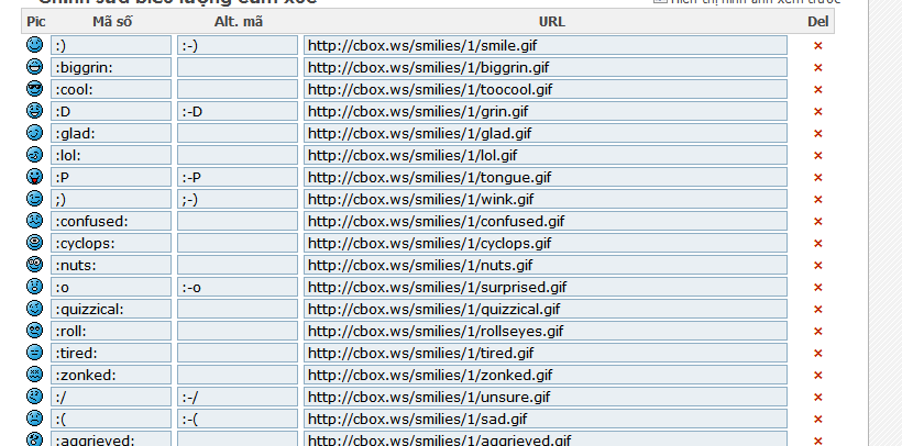 Bước 2: Quý Thầy Cô xóa hết các biểu tượng sẵn có của Cbox bằng cách nhấn vào dấu X màu đỏ ở bên phải của từng dòng trong khung biểu tượng.