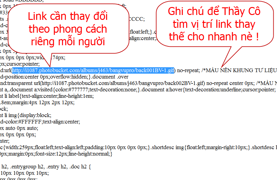 Bước 7: Up các hình trên lên Violet và lấy link thay vào các chỗ BV đã ghi chú ở các dòng đầu trang trong file CSS.